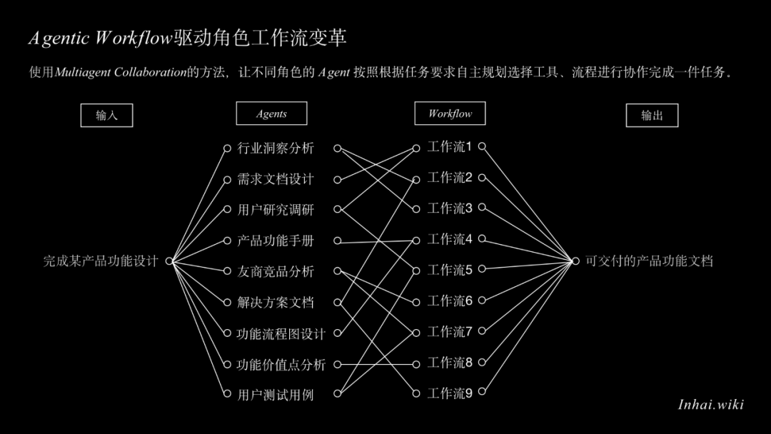 我作为一个产品经理角色,我的诉求很简单,需要完成某一个产品功能设计,这个时候通过Agents拆解成多个独立的任务,然后遵循不同的工作流,最后给我生成一份在大体上符合我期望的输出结果,我再修修改改就能够达到可用的阶段了。