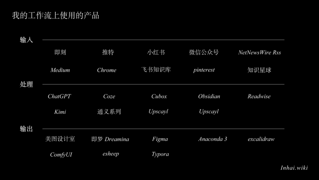 虽然我也推荐了一些我自己的工作流上使用的产品,但是我比较建议的是:每个人都是独特的个体,应该先摸清楚自己的日常工作流是怎么样的,然后通过每一个工作节点线索,去找到适合你自己使用的工具。