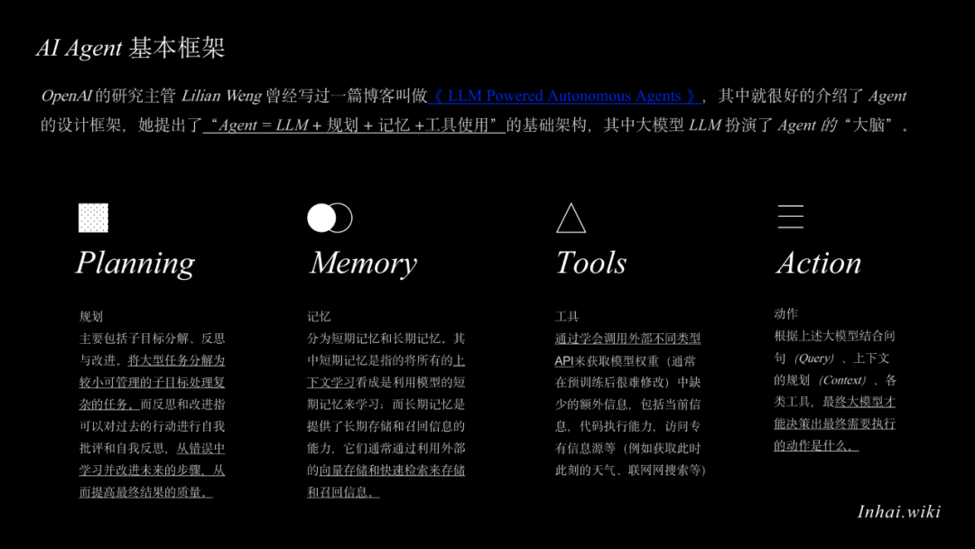 OpenAI 的研究主管 Lilian Weng 曾经写过一篇博客叫做《 LLM Powered Autonomous Agents 》,其中就很好的介绍了 Agent 的设计框架,她提出了“Agent = LLM + 规划 + 记忆 +工具使用”的基础架构,其中大模型 LLM 扮演了 Agent 的“大脑”。
