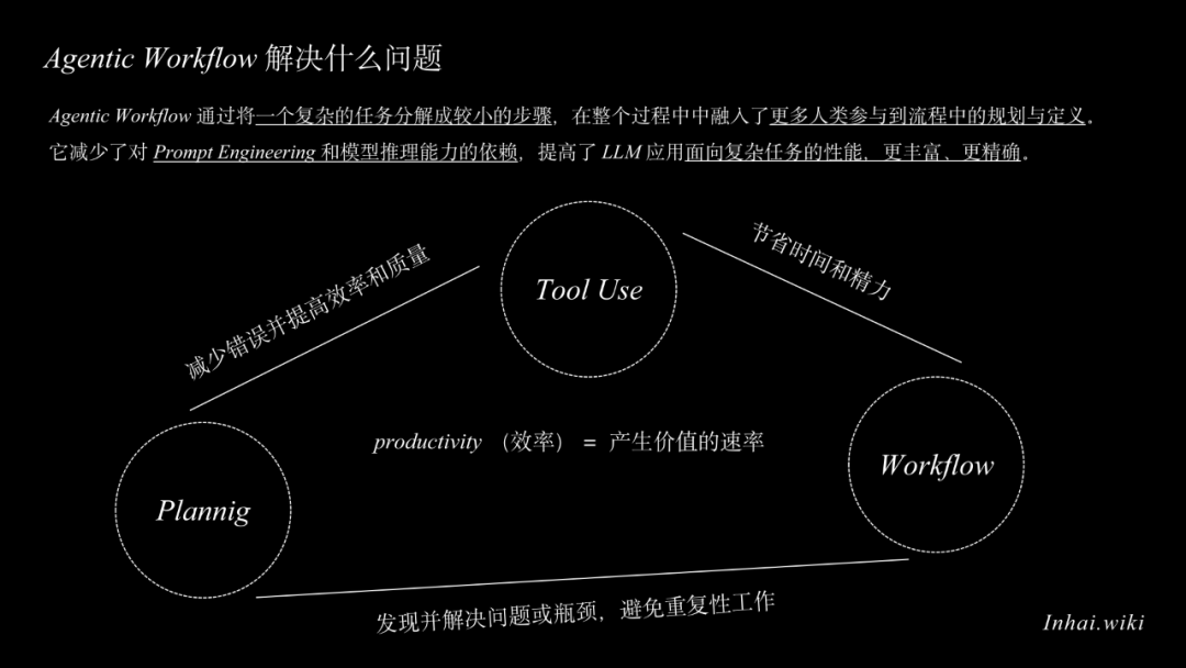 Agentic Workflow 解决什么问题?我认为是可以从从提升效率、提高质量、节省时间的角度上进行思考。好比一台“印钞机”,按照指定好的流程重复着机械性的活动,但是它在源源不断的产生价值。