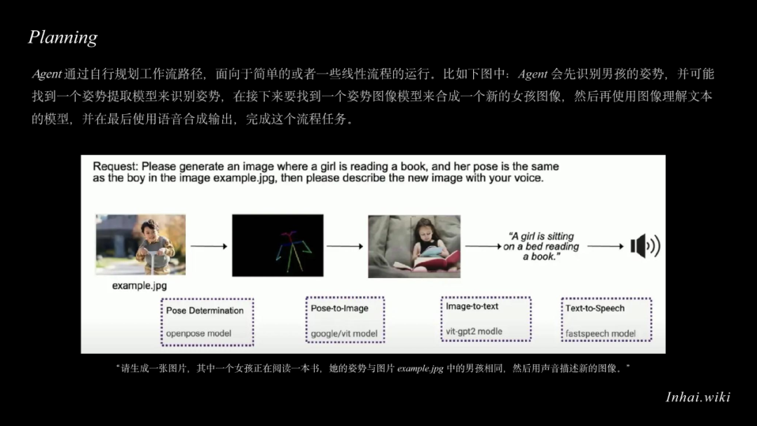 Agent 通过自行规划任务执行的工作流路径,面向于简单的或者一些线性流程的运行。比如下图中:Agent 会先识别男孩的姿势,并可能找到一个姿势提取模型来识别姿势,在接下来要找到一个姿势图像模型来合成一个新的女孩图像,然后再使用图像理解文本的模型,并在最后使用语音合成输出,完成这个流程任务。