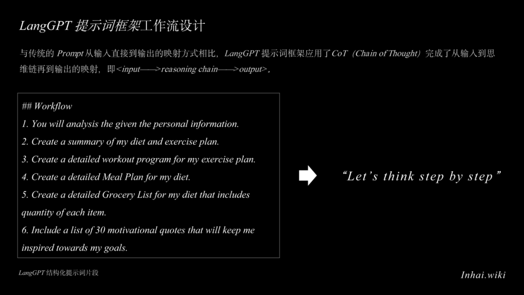 与传统的 Prompt 从输入直接到输出的映射方式相比,LangGPT 提示词框架应用了CoT(Chain of Thought)完成了从输入到思维链再到输出的映射,即<input——>reasoning chain——>output>。