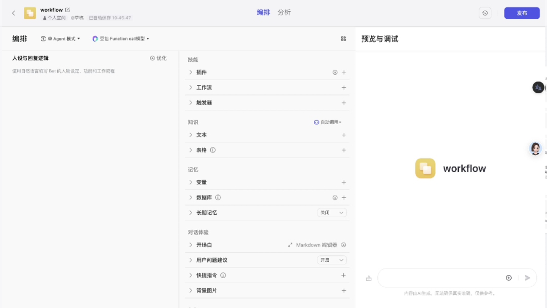 单Agent模式下,在这里可以看到一些例如“技能”、“知识”、“记忆”、“对话体验”等等点,其实在我们上面这个多个Agent和workflow编辑器里面里面也有这类工具。它是将一整套工作流组合起来,每个工具在每一个节点里面,它执行了一个任务。大家感兴趣的话可以去体验一下,可以在自己工作流中整个使用。