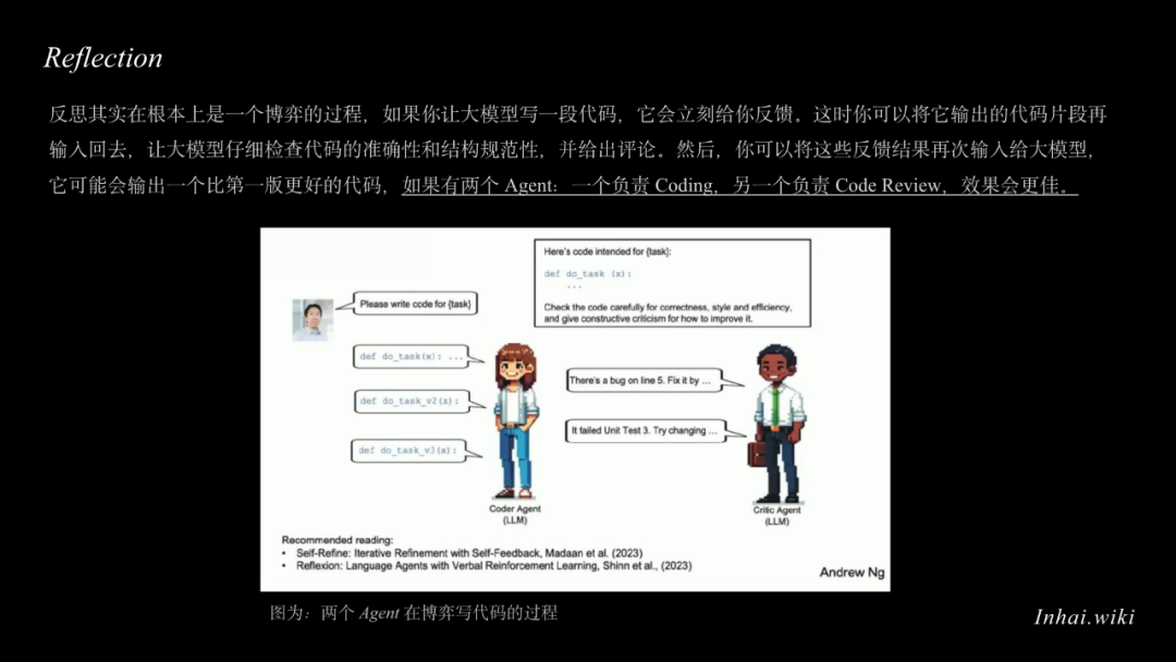 反思在根本上其实是一个博弈的过程:如果你让大模型写一段代码,它会立刻给你反馈。这时你可以将它输出的代码片段再输入回去,让大模型仔细检查代码的准确性和结构规范性,并给出评论。然后,你可以将这些反馈结果再次输入给大模型,它可能会输出一个比第一版更好的代码,如果有两个 Agent:一个负责 Coding,另一个负责 Code Review,效果会更佳。