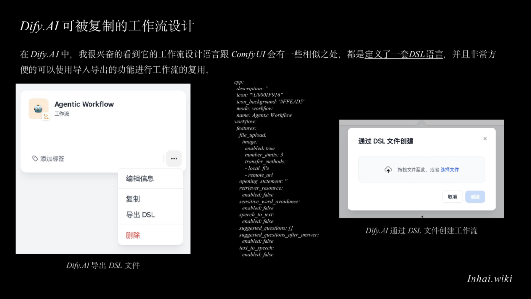 在 Dify.AI 中,我很兴奋的看到它的工作流设计语言跟 ComfyUI 会有一些相似之处,都是定义了一套标注化的DSL语言,并且非常方便的可以使用导入导出的功能进行工作流的复用。