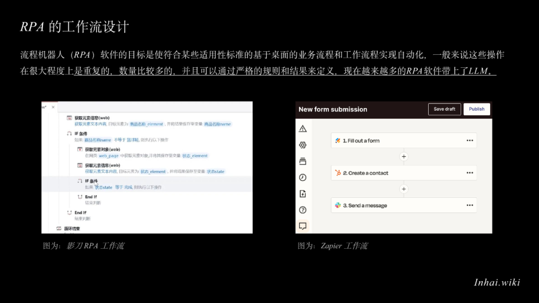 RPA其实很早就已经出现,就是做工作流编排领域。流程机器人(RPA)软件的目标是使符合某些适用性标准的基于桌面的业务流程和工作流程实现自动化,一般来说这些操作在很大程度上是重复的,数量比较多的,并且可以通过严格的规则和结果来定义,现在越来越多的RPA软件带上了LLM。