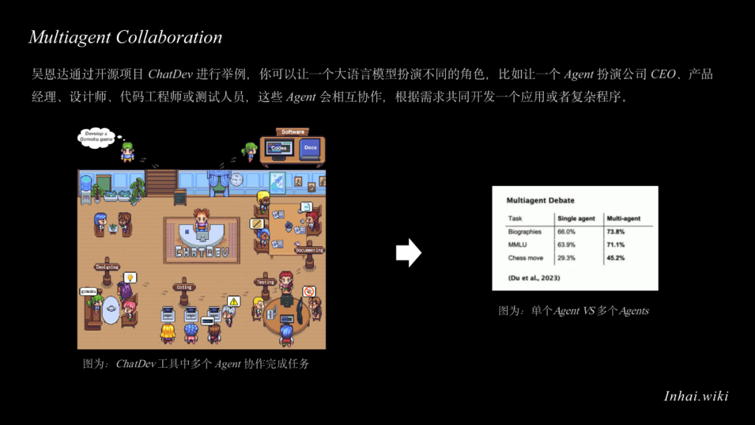 吴恩达通过开源项目 ChatDev 进行举例,你可以让一个大语言模型扮演不同的角色,比如让一个 Agent 扮演公司 CEO、产品经理、设计师、代码工程师或测试人员,这些 Agent 会相互协作,根据需求共同开发一个应用或者复杂程序。