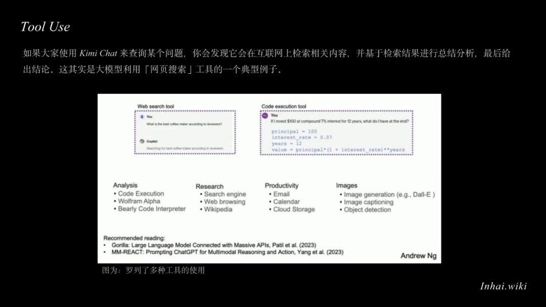 如果大家使用 Kimi Chat 来查询某个问题,你会发现它会在互联网上检索相关内容,并基于检索结果进行总结分析,最后给出结论。这其实是大模型利用「网页搜索」工具的一个典型例子,同时你也会看到PPT中介绍了非常多的不同领域类型的工具,它其实是为大模型在获取、处理、呈现信息上做额外的补充。