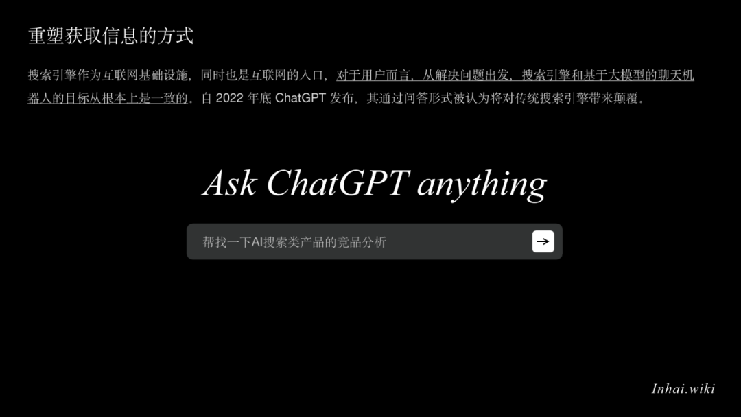 搜索引擎作为互联网基础设施,同时也是互联网的入口,对于用户而言,从解决问题出发,搜索引擎和基于大模型的聊天机器人的目标从根本上是一致的。自 2022 年底 ChatGPT 发布,其通过问答形式被认为将对传统搜索引擎带来颠覆。
