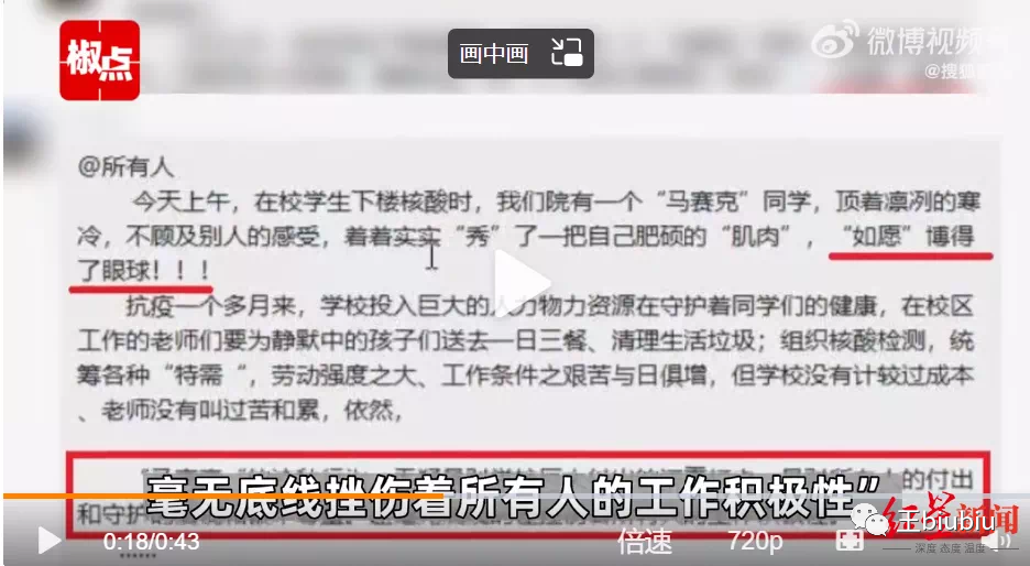 其次,一个穿着背心做核酸的学生,他的行为怎么就“是对学校巨大付出的沉重打击,毫无底线挫伤着所有人的工作积极性”?如果这都能挫伤学校所有人的积极性,这所谓的所有人,是不是有点过度脆弱,这是没长大的婴儿吗,时刻需要鸡血顶着,妈妈抱着,才能感受到这世界满满的感全感?