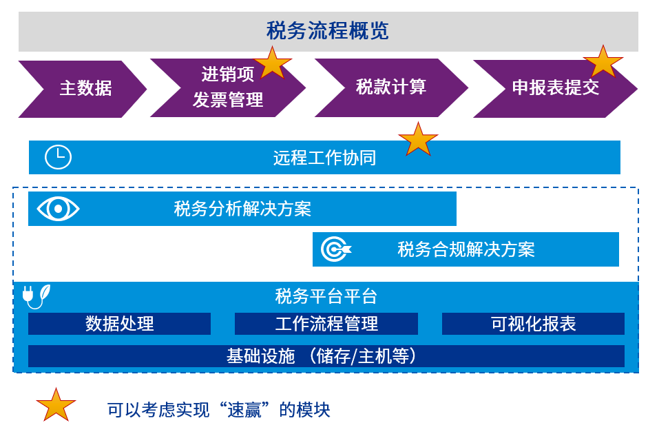 结合企业税务流程的主要节点(见上图),我们建议企业考虑下面几类的方案: