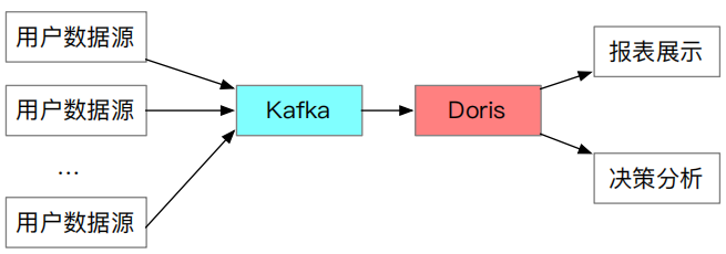 2、用户数据源经 Kafka 消息队列收集后,可以依次进入到 Doris 中,通过 Doris 做报表展示和决策分析等工作。