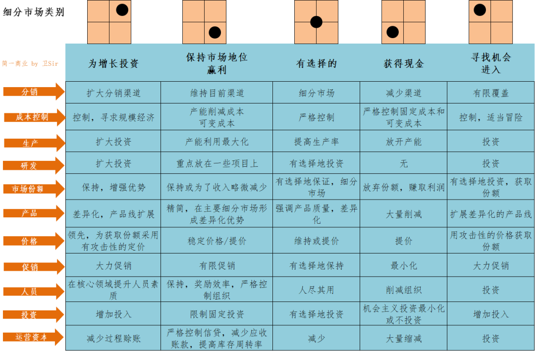 也就是说,应当尽量减少或者停止产能、研发费用、营销活动和运营资本,将资源分配到其他细分市场中。
