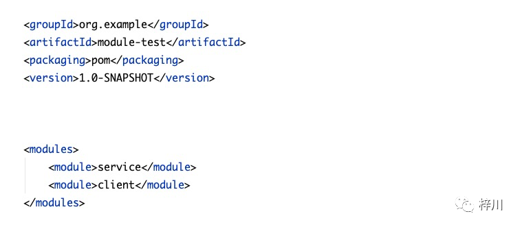 分为两个部分,一个部分是父 POM 的声明,包含 GAV 坐标,打包方式必须为 POM,因为需要使用聚合模型,另外一部分就是父工程管理的子模块 modules 标签。