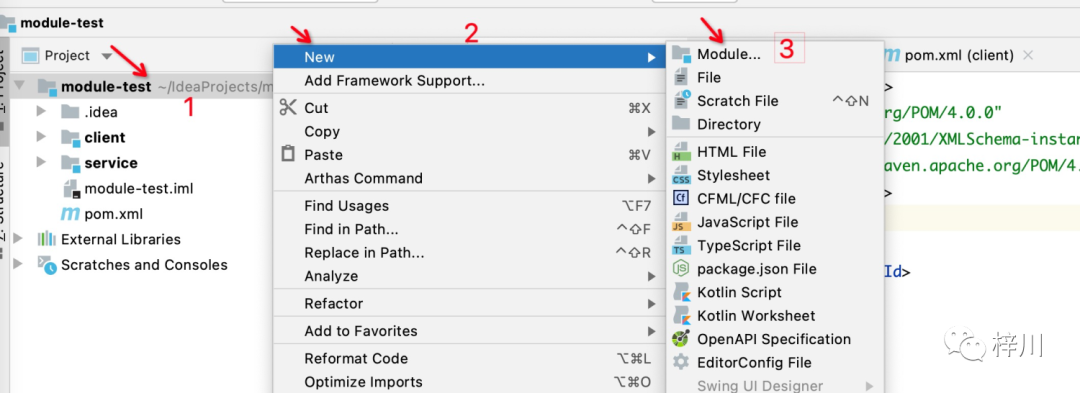 首先创建一个 Maven 项目,然后在通过上图的三步你就能完成一个新模块的创建。