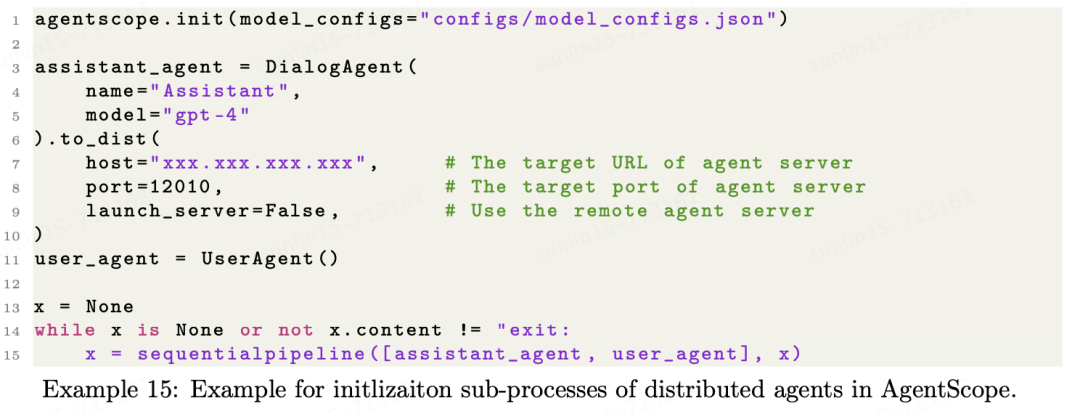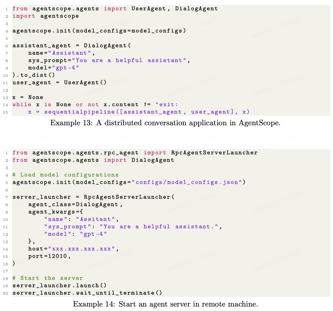 允许分布式智能体是 AgentScope 最引人注目的特点之一。本小节中将详细说明如何在两种模式下设置分布式应用:单台机器多进程模式和多台机器多进程模式。在单台机器多进程模式下,所有智能体都在一台机器上部署,每个智能体运行在单独的进程中。为了比较,作者实现了与独立对话相同的示例,但将助手智能体部署在自己的进程中。示例 13 展示了完整的代码,其中唯一的区别是从本地部署中调用 to_dist 函数。随后,智能体在本地主机上部署,并自动分配端口。除此之外,单台机器多进程模式与本地部署本质上相同,但已优化以进行并行执行。相比之下,多台机器多进程模式要求开发者在远程机器上启动智能体服务。示例 14 展示了在远程机器上启动 DialogAgent 的示例,示例 15 详细阐述了如何在多台机器多进程模式下构建工作流。在这种情况下,开发者必须使用指定的 URL 和端口连接到智能体服务器,然后构建工作流。与单台机器多进程模式类似,工作流的代码与本地部署相同。