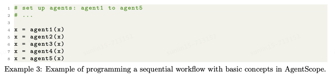 Pipeline Abstraction:管道抽象通过将消息传输的模式(包括顺序、条件和迭代交换)封装成简单、可重用的组件,减少了重复编码。有了管道,开发者可以专注于智能体交互的逻辑,而不是样板代码。示例 4 说明了如何在 AgentScope 中使用顺序管道以函数式和面向对象风格创建清晰、简洁的智能体工作流。除了示例中的顺序管道外,AgentScope 还提供了 if-else、switch、while-loop 和 for-loop 管道,以促进多智能体交互的编程。
