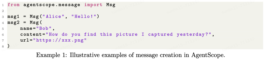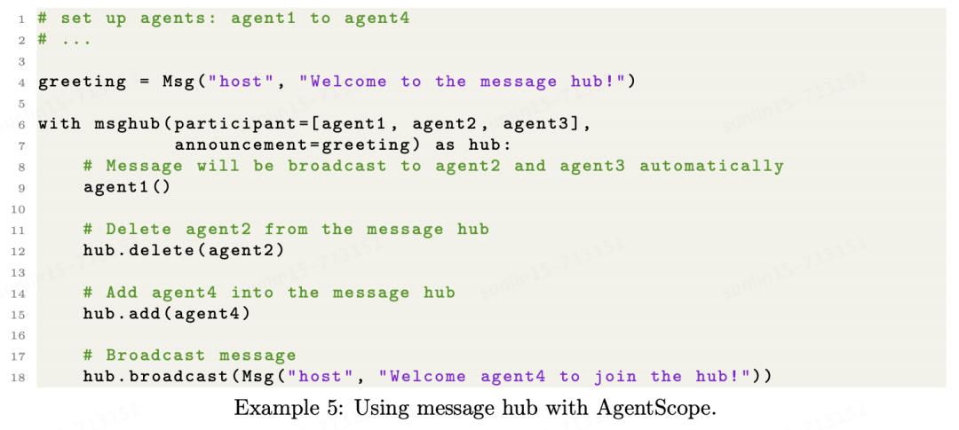 Message Hub for Agent Communication:在多智能体系统中,尤其是与 LLMs 集成时,有效管理智能体之间的通信至关重要。AgentScope 中的消息中心充当广播机制,简化了组交互。开发者可以通过定义参与的智能体并包含初始广播消息来启动消息中心。当智能体在消息中心内生成新消息时,它们会自动传播给其他参与者,如示例 5 所示。这种抽象对于涉及 LLMs 的多智能体场景特别有用,其中动态和情境丰富的对话很常见。