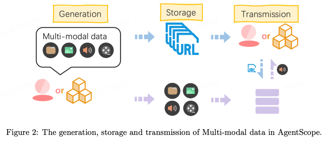 多模态数据的管理:在 AgentScope 应用中,多模态数据的生命周期被仔细管理。这包括多模态数据的生成、传输和存储——所有这些都是通过使用 URL 和本地文件管理系统的解耦架构来实现的。图 2 示例了这一过程,包括来自用户输入或模型生成的数据、数据存储和检索以及数据共享。