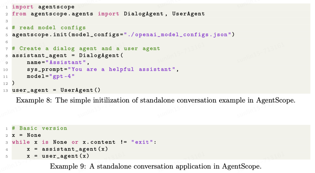 AgentScope 的基本应用在于促进独立对话,其中所有智能体都在主进程中运行。这个用例为新用户提供了一个极好的起点,让他们可以熟悉框架的基本功能。启动应用程序的第一步涉及初始化智能体对象。在这个例子中,我们使用 AgentScope 内置的两个智能体,DialogAgent 和 UserAgent,来促进用户和 AI 助手之间的对话。在实例化这些智能体之前,必须通过 AgentScope 的 init 接口加载模型配置。目前,AgentScope 兼容多种平台,包括标准的 OpenAI 聊天、嵌入和 DALL-E API,HuggingFace 和 ModelScope 推理 API,以及使用 FastChat、vllm 或 Flask 本地托管的模型。此外,init 接口还允许指定文件存储目录、存储选项、日志级别和智能体配置等。设置模型配置后,开发者可以使用其各自的模型实例化智能体,如示例 8 所示。随后,可以通过交换智能体之间的消息构建对话。具体来说,对话过程被设计成一个循环,允许持续互动,直到用户选择结束对话。示例 9 展示了在 AgentScope 中的基本实现。