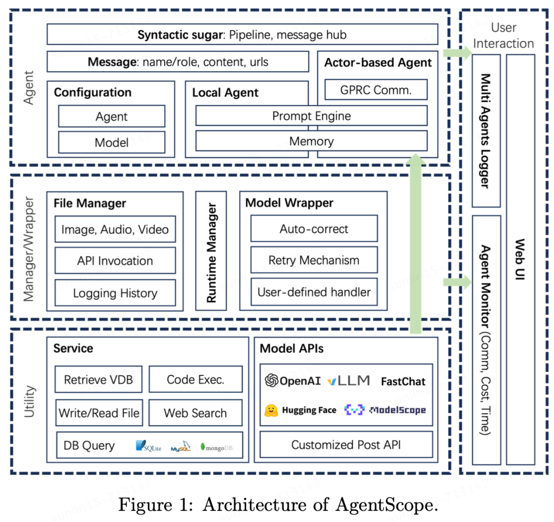 实用层(Utility Layer):作为平台的基础,AgentScope 的实用层提供了支持智能体核心功能的基本服务。这一层抽象了底层操作的复杂性,例如 API 调用、数据检索和代码执行,允许智能体专注于它们的主要任务。AgentScope 的实用层以易用性和鲁棒性为最高优先级设计,支持多智能体系统中的多种操作,并提供内置的自主重试机制,用于异常和错误处理,以应对意外中断。
