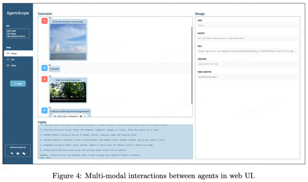 多模态交互模式:通过实现 URL 附加消息,AgentScope 赋予用户通过可访问的接口(如终端和 Web UI)与多模态系统交互的能力。图 4 展示了用户在交互模式中与多模态数据交互的能力。在终端中,用户可以通过激活提供的 URL 方便地访问本地存储的数据。Web UI 进一步增强了用户体验,提供了一个直观的平台来查看和分析多模态内容,符合现代 Web 应用的期望。