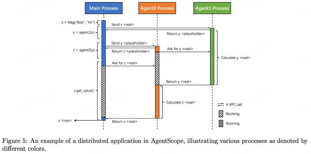 然而,基于 actor 模型的工作流提出了一个编程挑战:在 actors(即智能体)之间传递的变量(即消息)在开始时可能是占位符,没有任何实际意义。为了缓解这个问题,AgentScope 引入了“占位符”消息,这是一种新的数据结构,允许主进程在不阻塞的情况下继续进行,同时保留稍后检索实际值所需的信息(图 5)。这种机制对于多智能体 LLM 系统特别有利,其中执行流程必须适应语言模型的可变输出。