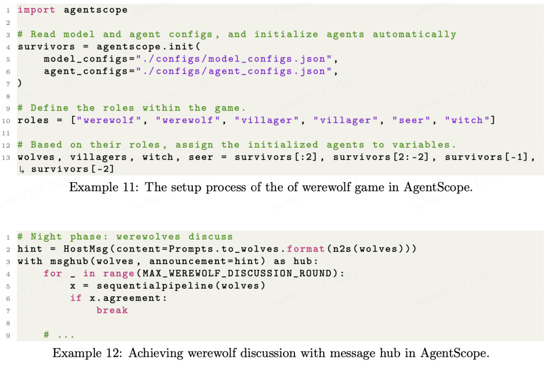 在更复杂的应用中,本小节展示如何在 AgentScope 中使用大约一百行代码编写狼人杀游戏的工作流。狼人杀是一个社交推理游戏,其中六名玩家分为两个对立的团队:狼人和村民。当所有狼人被消灭时(村民胜利),或者狼人的数量等于或超过村民时(狼人胜利),游戏结束。设置游戏涉及角色分配和智能体初始化。AgentScope 支持使用预设的智能体配置快速启动,其中包含了实例化智能体对象所需的参数。