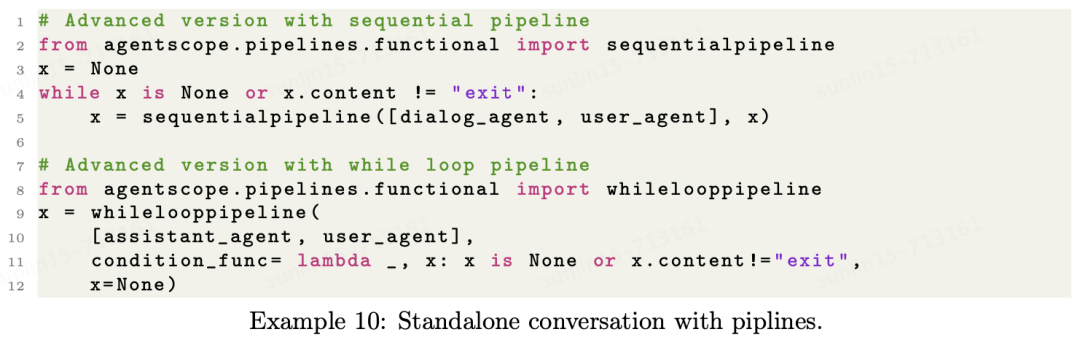 为了迎合更高级的应用,AgentScope 整合了管道来管理消息交换,从而为复杂的智能体交互提供了一个结构化和可扩展的框架。这里,这个独立对话应用的实现可以通过顺序管道和循环管道来简化,如示例 10 所示。此外,附录 A 通过运行上述代码展示了对话历史。