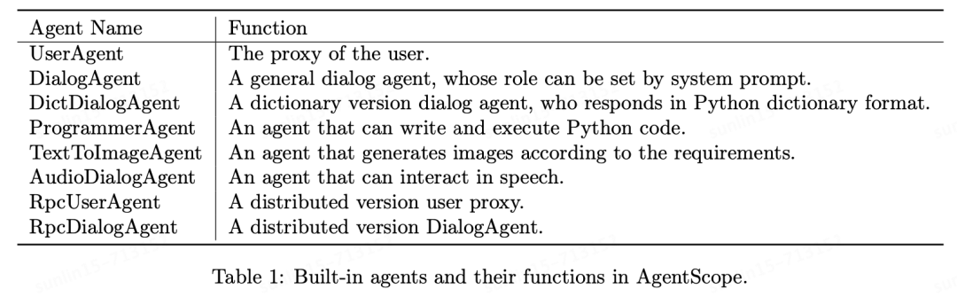 Pre-built Agent Templates:如表 1 所列,AgentScope 提供了预构建的智能体和即用组件,用于对话管理、用户代理、多模态数据处理等任务。