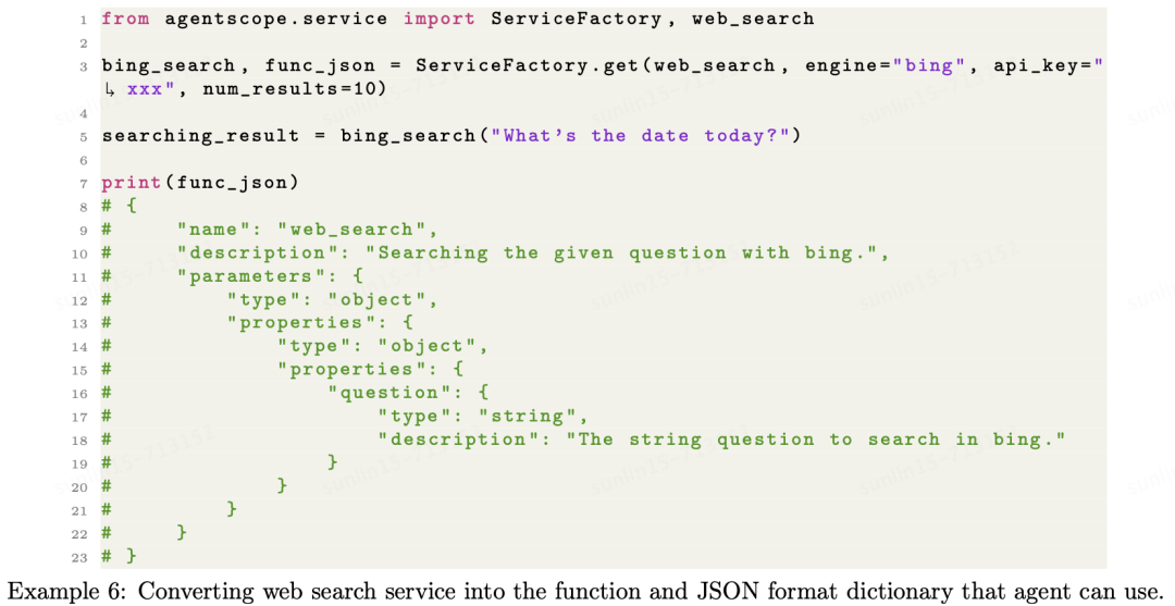 Comprehensive Service Integration:AgentScope 集成了各种服务,如网络搜索、数据库查询和代码执行,以支持智能体的能力。这些服务对于构建具有 LLMs 的有用智能体至关重要,因为它们通常需要从外部来源获取信息或执行超出装备的 LLMs 内部知识的任务。示例 6 展示了如何将服务无缝转换为 OpenAI 兼容的 JSON 格式,简化了开发者的集成过程。