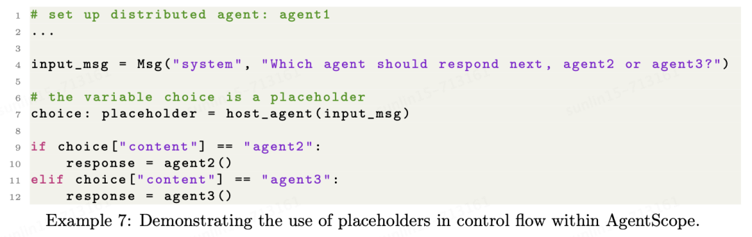当在没有实际值的情况下在控制流语句(例如 if-else、循环)中使用占位符时,会出现一系列挑战。示例 7 展示了一个例子,其中需要一个占位符来做出决策。在这种情况下,AgentScope 暂时阻塞进程以检索其实际值,从而确保控制流的连续性。