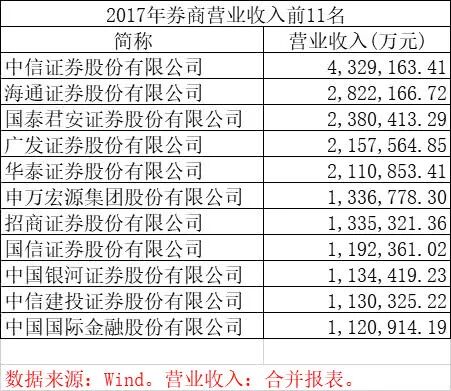 根据2017年年报数据,目前证券行业营收前十公司包括:中信证券、国泰君安、海通证券、华泰证券、申万宏源、中信建投等。