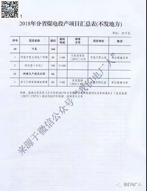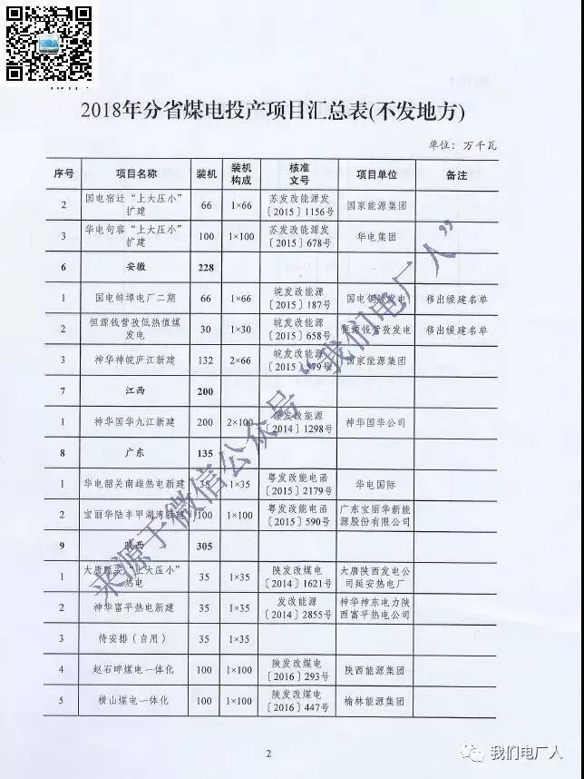 2018年分省煤电投产项目汇总表(不发地方)名单如下:
