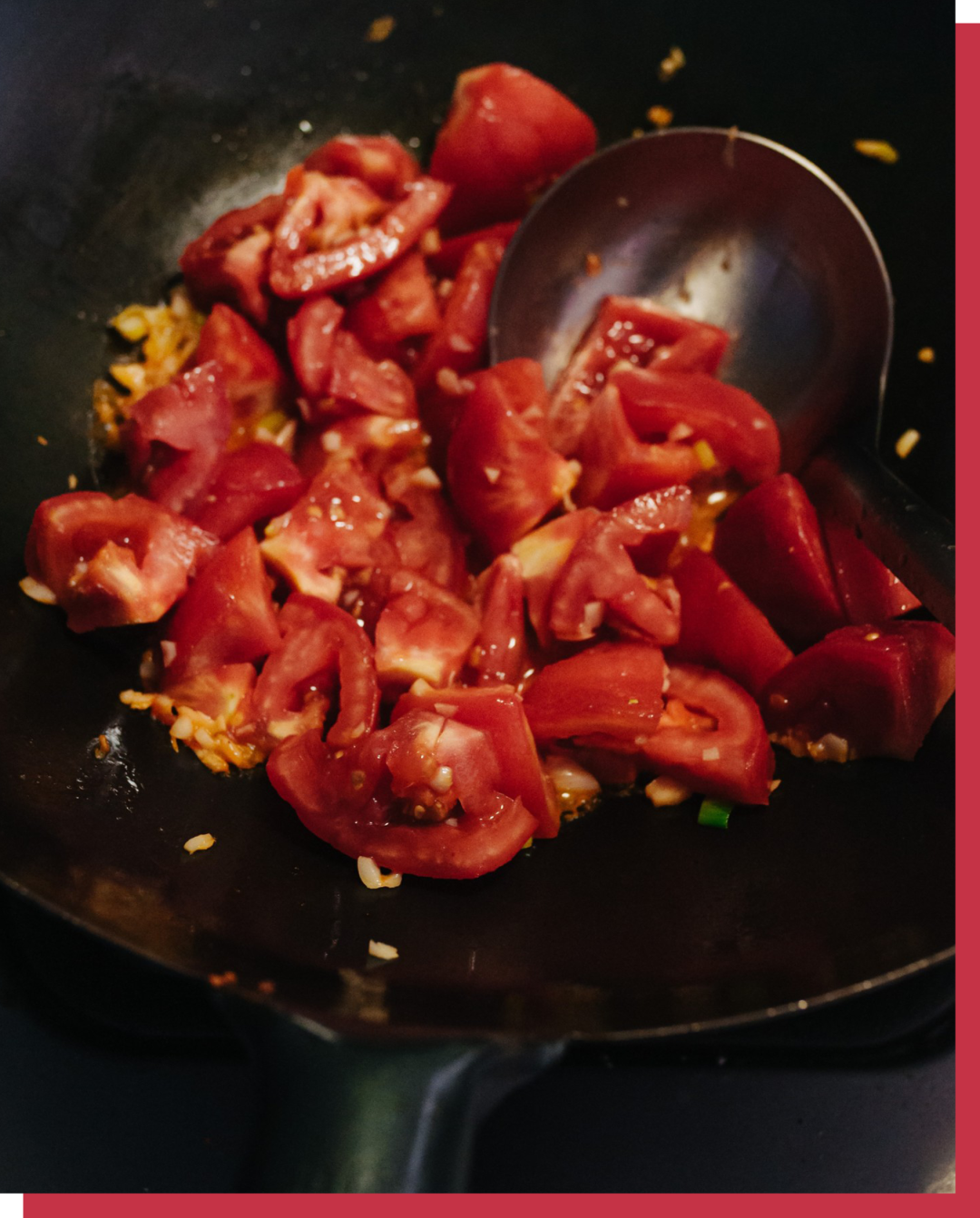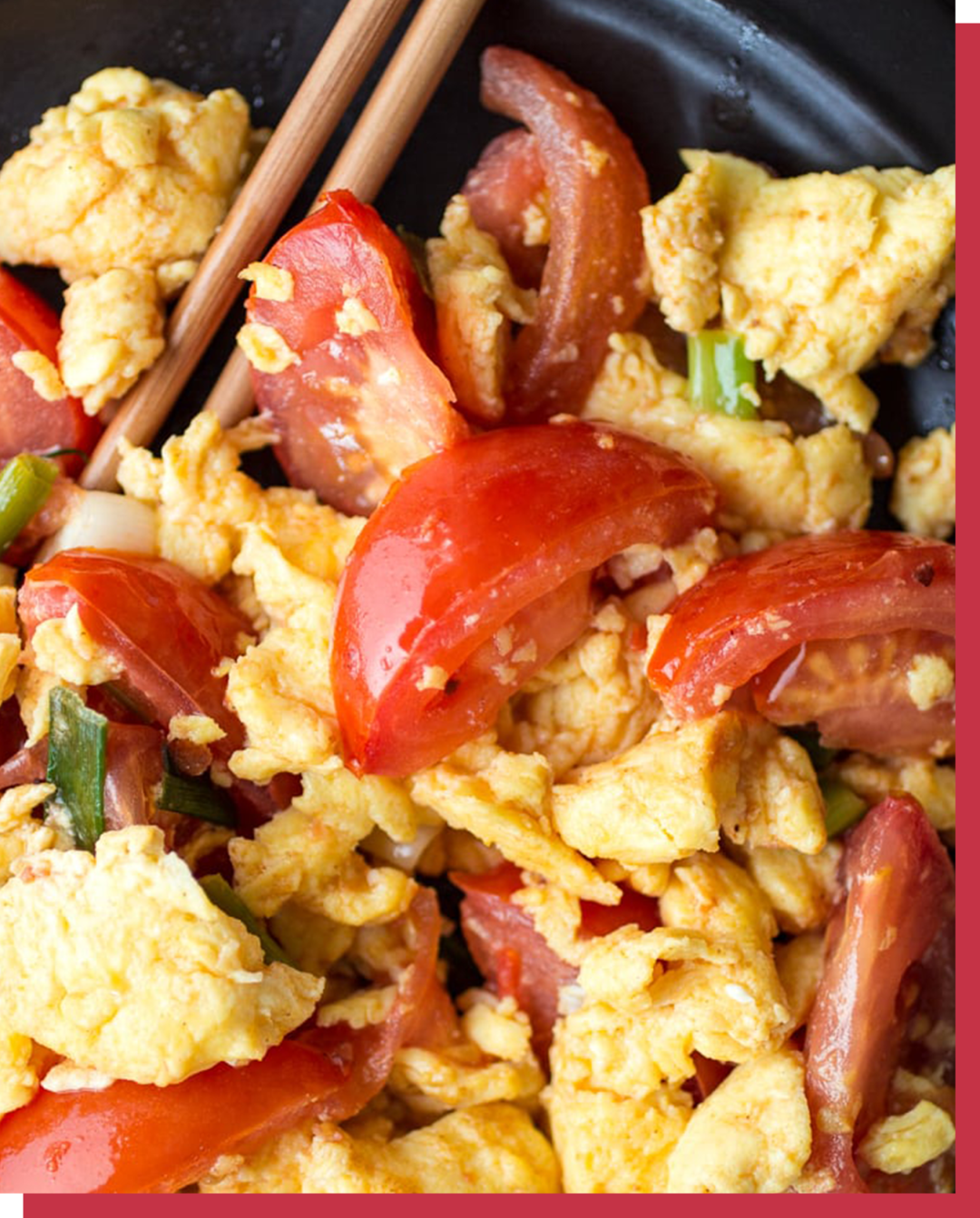 有趣的是,早在 1824 年的美国南部地区,美国第三任总统托马斯 · 杰斐逊的表妹玛丽 · 伦道夫(Mary Randolph),这个终生在厨房忙碌的主妇出版了一本料理书《弗吉尼亚家庭主妇》,详细记录了西红柿炒鸡蛋的食谱:「将 12 个大番茄去皮,在煎锅中放入 4 盎司牛油,加入适量的盐、胡椒,放进一些切丁的洋葱炒香,随后放入番茄,快要炒好时,再打进 6 个鸡蛋,迅速搅拌之后,随机装盘上菜」,这也是目前最早关于西红柿炒鸡蛋的食谱,比中国早了百年有余。回到 20 世纪 40 年代的中国,在抗日战争时期,汪曾祺先生在西南联大上学,昆明的西红柿炒鸡蛋令他久久难以忘怀,特地写在《昆明菜》一文中。「番茄炒至断生,仍有清香,不疲软,鸡蛋成大块,不发死。番茄与鸡蛋相杂,颜色仍分明,不像北方的西红柿炒鸡蛋,炒得『一塌糊涂』。」这一道番茄炒鸡蛋,自然有他的讲究,色泽分明,不疲软,香味犹存。那年月那时局,不过与老舍先生所处的时代晚了几年光景,谁曾想番茄却在抗战期间得以规模栽培,逐渐呈现出新的态势,以二倍速拓宽了餐桌的边界。西红柿炒鸡蛋,细细数来,不过 6 个字,却用一个动词烘托出掌勺之精妙。毕竟「炒」这件事,算得上是中国最为特色的烹饪技艺。炒,曾被人翻译为 Scramble Fry ,意指连搅带炸,后有人用 Stir-fry 来指代,Stir-fry 加上了火候,明确指明是拿旺火炒。想来,西洋人是无法领略中国人揣着铁锅在明火上翻翻搅搅颠颠的快乐,炒菜得用尖底的铁锅,得有旺油大火,得眼明手快,得掂起把儿勺,兴起的时候,把锅里的食物带着汤汁向上飞抛起来,瞬间稳稳当当地接住。一红一黄的配色,催动食欲。
