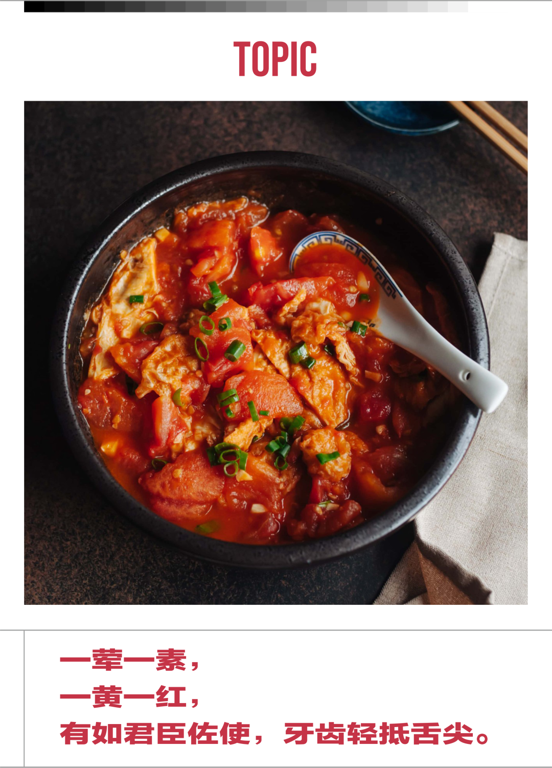 西红柿炒鸡蛋,作为入门级的中餐,一搅一翻在所难免,可就是这一道看似平平无奇的家常菜,想要保留蛋的滑嫩,非重视火候不可,没旺油大火炒出来的东西不嫩,清人袁枚在《随园食单》里也说,「熟物之法,最重火候。有须武火者,煎炒是也,火弱则物疲矣」。放眼全世界,没有哪个民族比中国人更讲究调和,在意和谐。民生如此,饮食更是如此。调和是有奥秘的,清者配清,浓者配浓,柔者配柔,刚者配刚,才有和合之妙。也因此,才有「烹调之法,何以异端?凡一物烹成,必需辅佐」这一说。说回西红柿炒鸡蛋里不可或缺的鸡蛋。这一最能信手拈来的食材,仿佛无论与谁搭档,都能成就一出完美。中国香港美食家蔡澜吃尽山珍海味,依旧为鸡蛋着迷,这是最平凡、最低微、最谦卑的食材,却能调和出无限的美味,他说:「鸡蛋可以配合所有食材,咸的从最贵的黑白松露,各种鱼子酱,到最普通的西红柿或豆芽,每一道菜都不重复」。故而,当鸡蛋与西红柿相遇,一荤一素,一黄一红,一气呵成,有如君臣佐使,牙齿轻抵舌尖,番茄的甘甜汁液和瞬间溢出的蛋香交织出肆意奔走的鲜美,嫩滑与细腻满足口腹之欢,也魔幻般地锁住了中国人对它不可割舍的情结。参考资料: