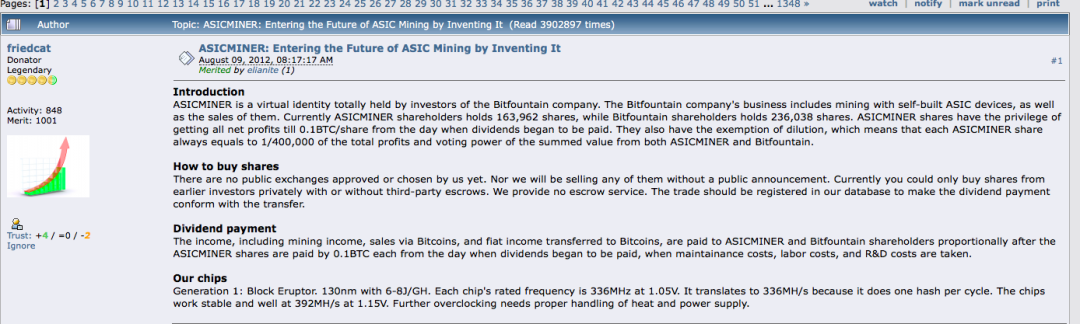 接着,烤猫在GLBSE交易所成功进行了众筹,股票名为ASICMiner,日后烤猫的矿机也以此为名。烤猫把公司股份分为40万股,对外出售了41%,自己则持有59%。