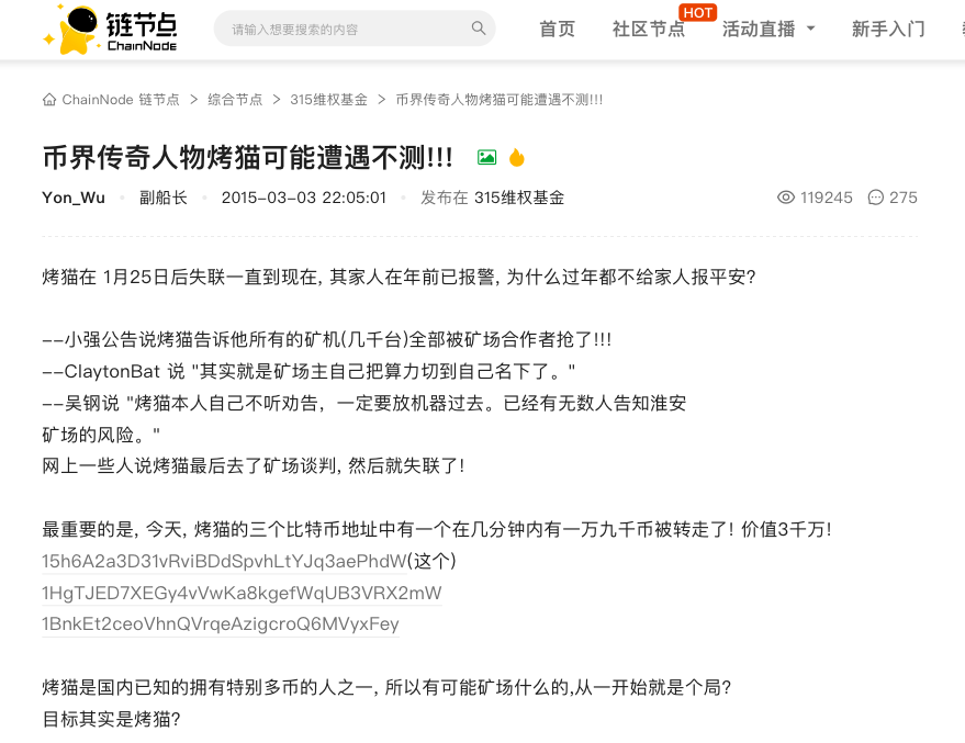 但在2014年底,他却离奇消失,没有留下只字片语。他的失踪疑点重重,被圈内人称为“币圈十大未解之谜之一”。
