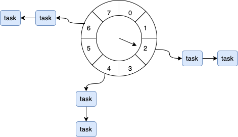 如图,时间轮会被分成很多格子(上述demo中的8就代表了8个格子),一个格子代表一段时间(上述demo中的100就代表一个格子是100ms),所以上述demo中,每800ms会走一圈。