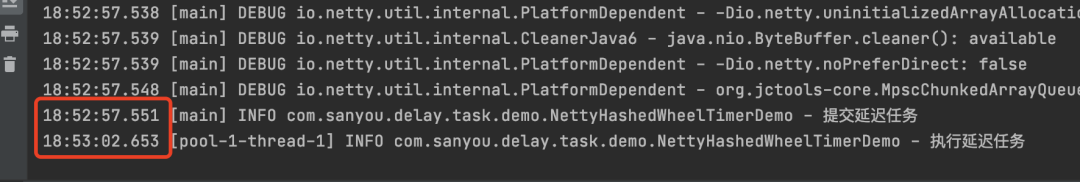 timer.newTimeout(timeout -> log.info("执行延迟任务"), 5, TimeUnit.SECONDS);
