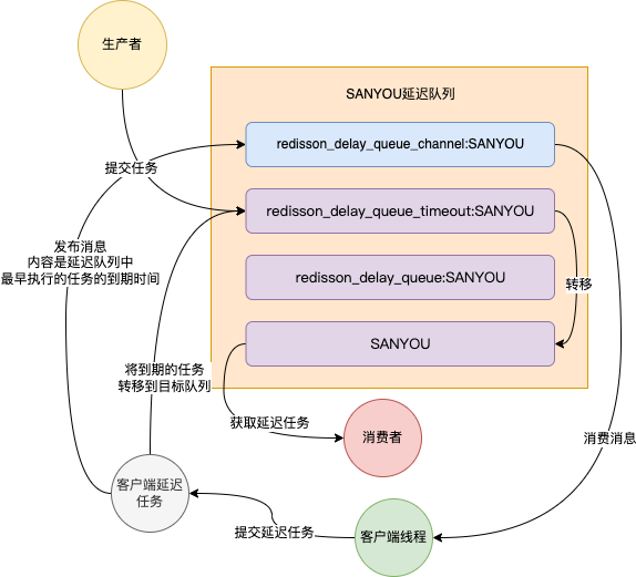 Redisson客户端内部通过监听redisson_delay_queue_channel:SANYOU这个channel来提交一个延迟任务,这个延迟任务能够保证将redisson_delay_queue_timeout:SANYOU中到了延迟时间的任务从redisson_delay_queue_timeout:SANYOU中移除,存到SANYOU这个目标队列中。