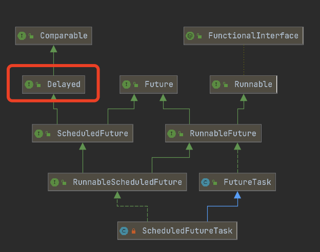 ScheduledFutureTask实现了前面提到的Delayed接口,所以其实可以猜到DelayedWorkQueue会根据ScheduledFutureTask对于Delayed接口的实现来排序,所以线程能够获取到最早到延迟时间的任务。
