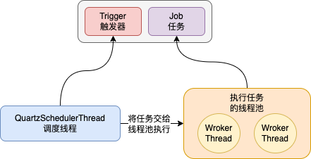 启动的时候会开启一个QuartzSchedulerThread调度线程,这个线程会去判断任务是否到了执行时间,到的话就将任务交给任务线程池去执行。