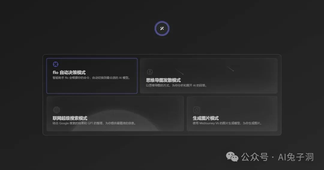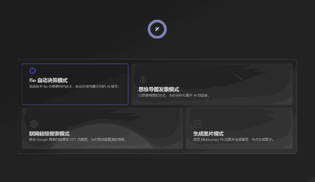 flowith提供四种使用场景,也可以说是四种交互模式,分别是✨自动决策模式、🧠思维导图发散模式、🌏联网超级搜索模式、📷生成图片模式。