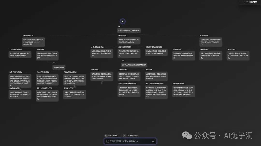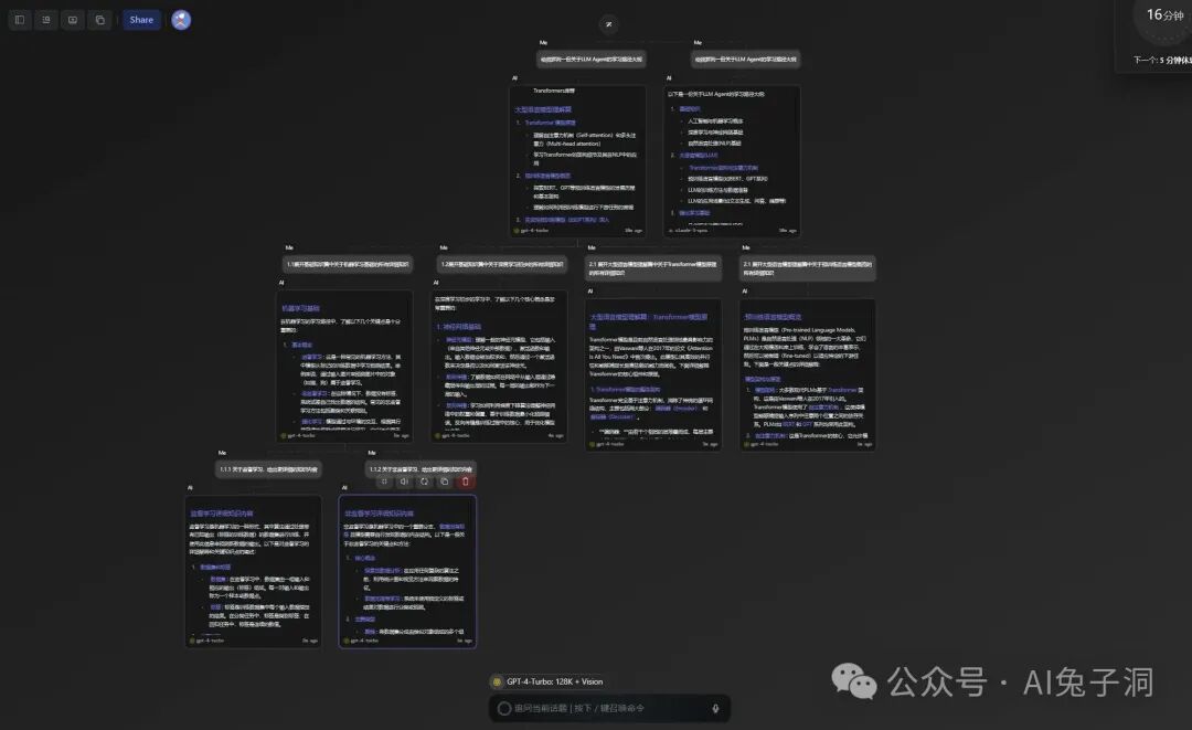 再比如我们可以利用画布的特性,使用大模型的能力进行一场”酣畅淋漓”头脑风暴,将话题讨论的每个观点都通过思维导图的方式记录下来,方便回溯和查看。