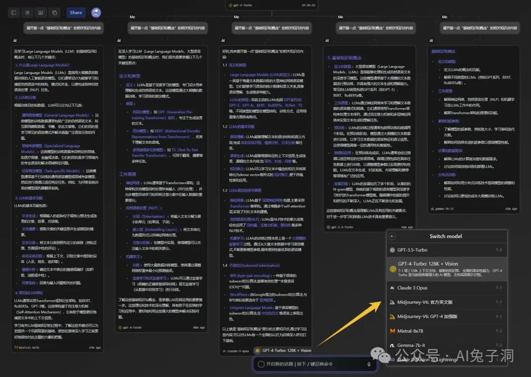 比如我让大模型给我输出一份学习LLM Agent的学习路径,通过画布交互,我不仅可以让多个AI模型给我处理需求,查看不同模型能力的输出情况;还可以在对话过程中,很自然的将输出内容生成一份脑图,将知识点构建成一个有组织结构的知识树,这让梳理知识体系的效率得到了大大的提高。
