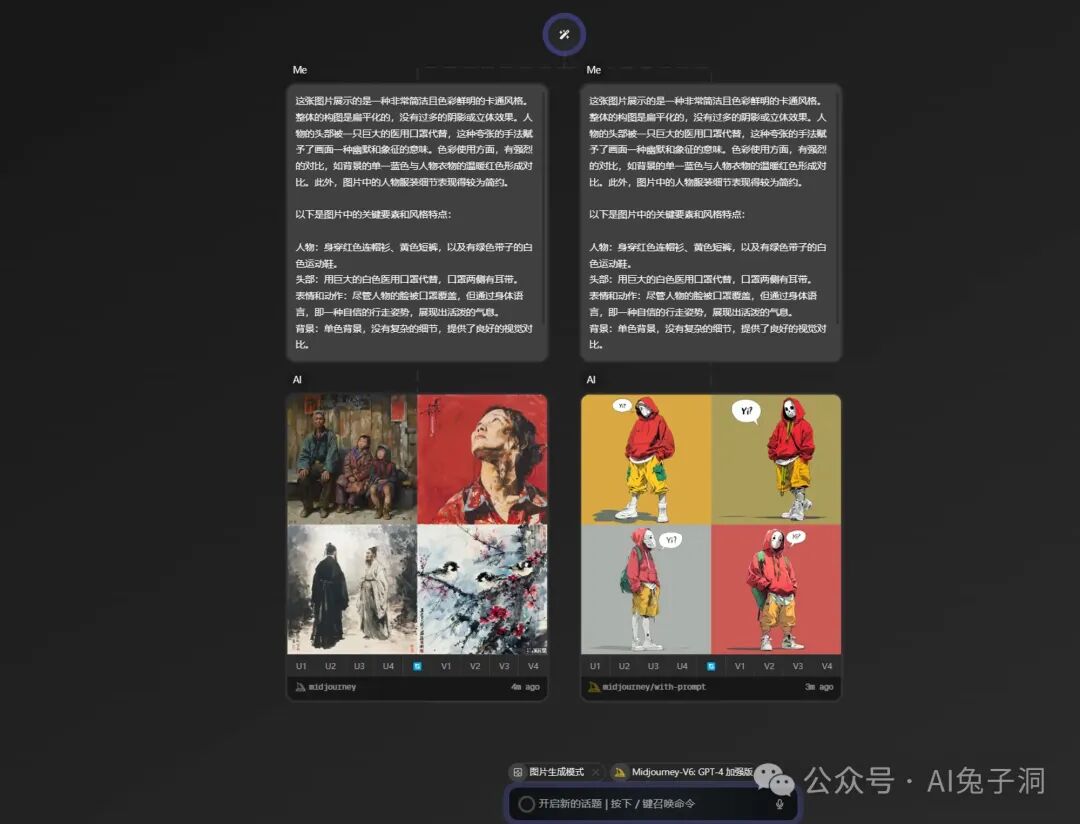 图片生成模型中对接了MJ-V6 和 SD XL 两个API,都是T1级别的存在,平台还很贴心用GPT4辅助生成画图Prompt的加强版模型,这样就能中文对话进行画图。