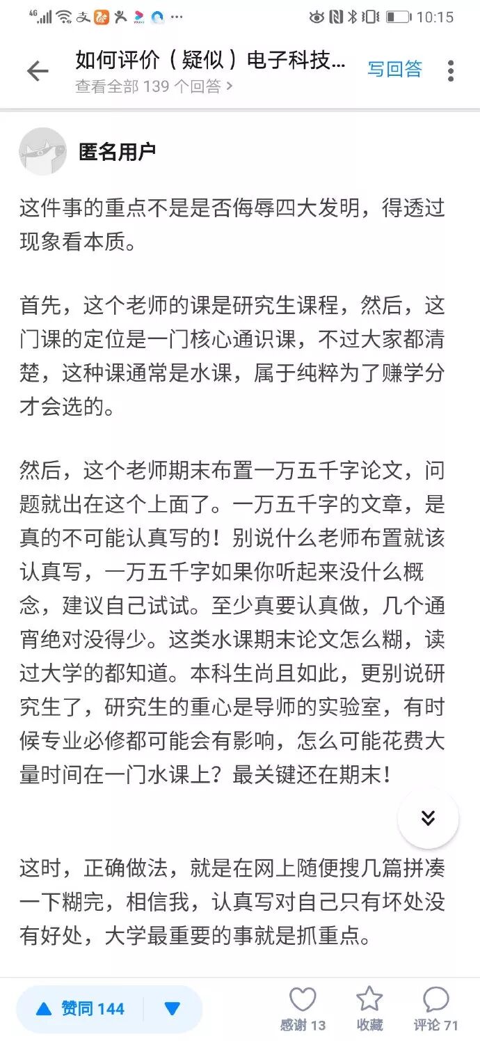 可他们还是需要学分。拿到郑老师的学分,必须完成三篇课程作业,总字数1.5万字。事情就这样爆发了。当郑老师在QQ群中提醒,不要写高中作文哦,随即贴出了一篇歌颂中国古代四大发明的学生作业,说这就是强行把高中作文变成论文。