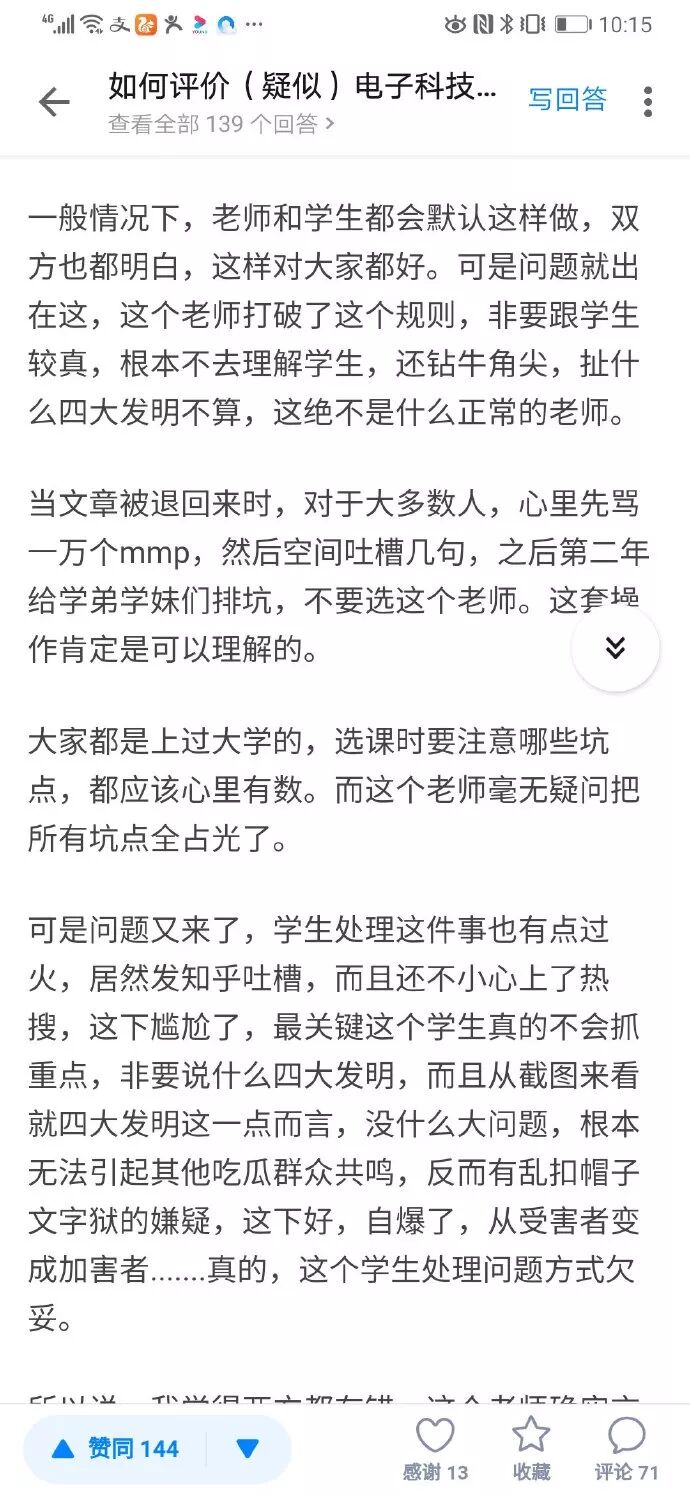 显而易见的是,郑老师对选了课而不去上现在又想尽办法要学分的学生是不满的。是个人都能理解这种不满。关于为什么写四大发明不能通过,或者他们的“马云爸爸”模式为什么不算创新都做了有理有据的解释,回答了学生的问题。从贴出的对话看,这位郑老师头脑很新,治学严谨,在为人师表的风范上也并无可挑剔之处。