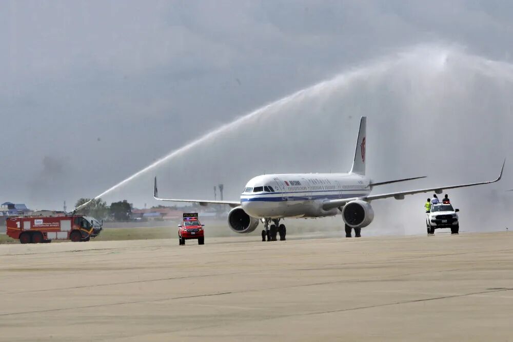 2月7日中午,一架载有125名乘客的中国国航航班在柬埔寨首都金边国际机场徐徐穿过水门。飞机“过水门”仪式极具象征意义,寓意给来客“接风洗尘”,属国际民航中最高规格礼遇。2月7日,国航航班在柬埔寨首都金边国际机场接受水门礼。新华社发(批隆摄)